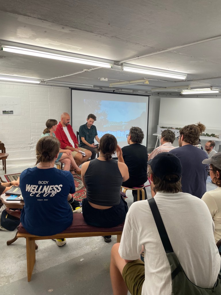 Utilising the teams photodiagrams from the Sydney Park stormwater rain garden, we activated the work to engage with local stakeholders, asking questions such as “What is artificially invited into these spaces?”. Participants are encouraged to write or draw their own views and inputs on post-it notes, sticking them alongside the photodiagrams to create conversations of space, ecologies, and cultural significance.