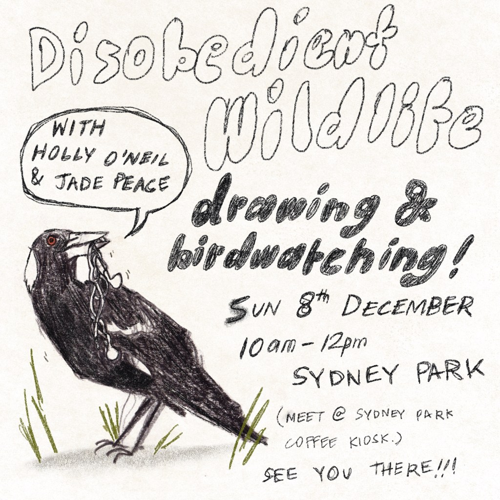 On the 8th of December, Holly O’Neil will be joined by bird-watching guide Jace Peace on a walk through the Sydney Park Wetlands to spot the unruly critters of Sydney, exploring how drawing on location can help to tell stories of place, and allow us to see and investigate the layers of history and habitat around us.