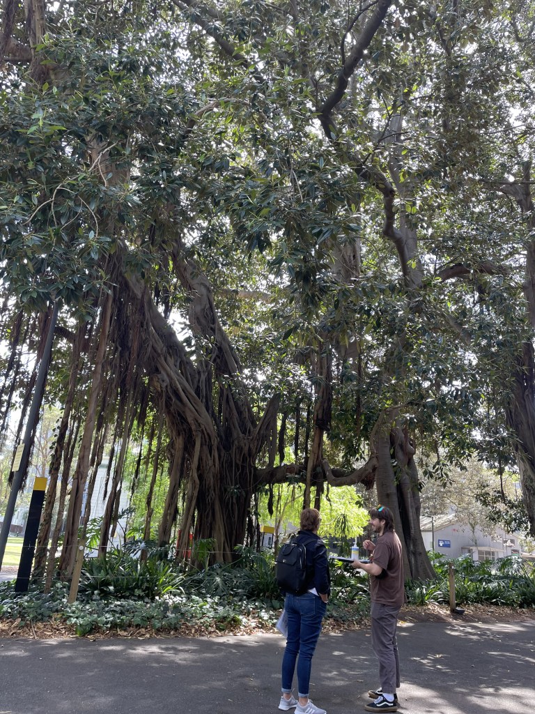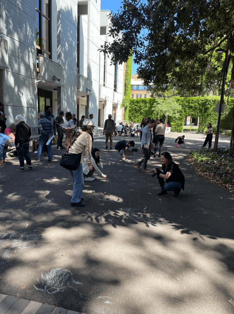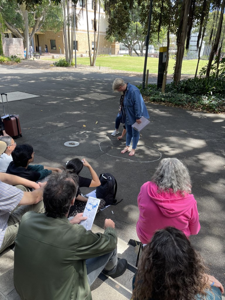 We continued down to the fig trees that sit amidst UNSW’s modern campus, where Associate Professor, Bernadette (B) Hardy reflected on connecting to Country, and invited us to “seek permission” from these ancient figs – to consider both the trauma and joy these natural entities can hold space for. We were invited by walk facilitators to draw, in chalk, beneath the tree: capturing the ever-changing, dappled light on the pavement below.