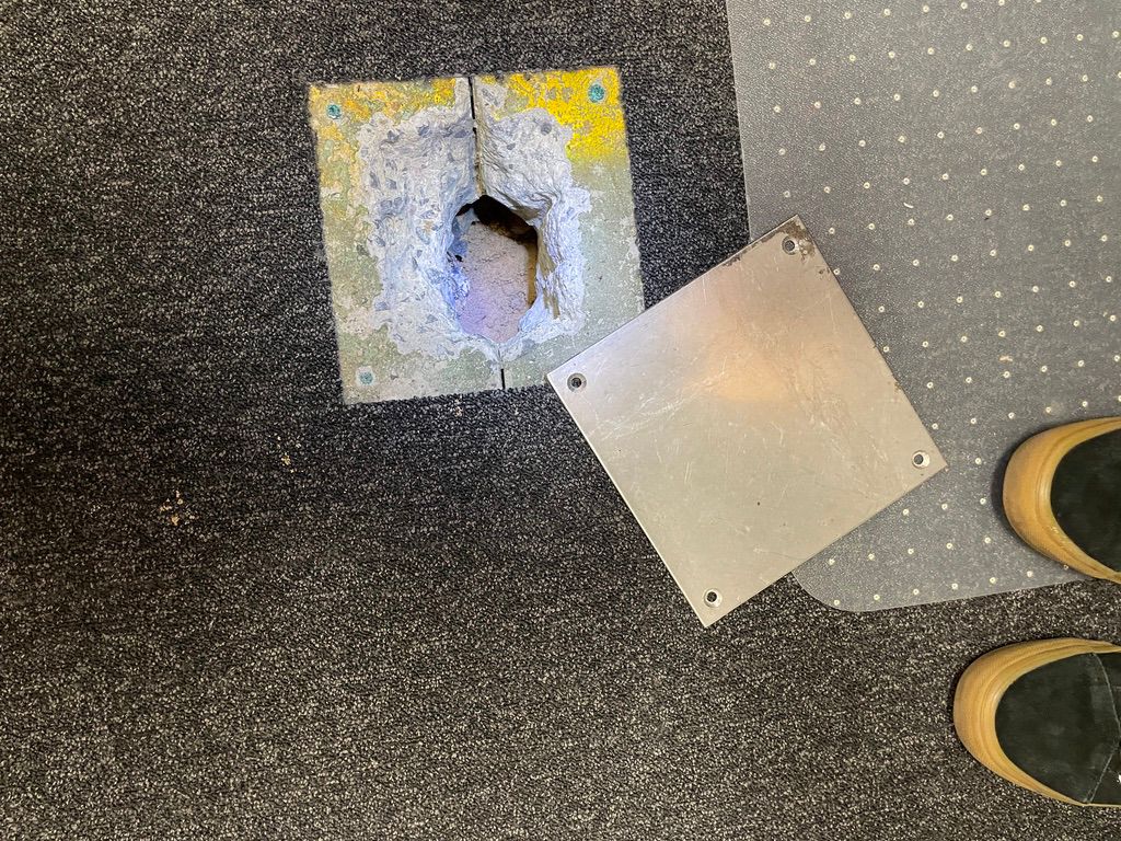 We continued our walk down towards the UNSW Creative Lab, a basement level set of studios which, in recent years, have been prone to flooding. Due to concerns of damage, two separate systems were put in place to monitor water levels within the aquifer below the buildings foundations. These are equipped with sensors, that warn staff in the lab of flooding risks. However, these “portals” (Vanni), mean that by unscrewing the cover and reaching down and into the holes in the floor, one is able to touch the sandy aquifer and pull up sand from it. Aunty Rhonda reached down to take a handful of that sand in a moment, as B Hardy reflected, of connecting the original custodians of the land to the aquifer after over 200 years. This immediate connection to the natural ground and Country beneath the foundations of the building, brought home the layers of time and space on which we walk and live our lives, and how physically close we are to these connections.