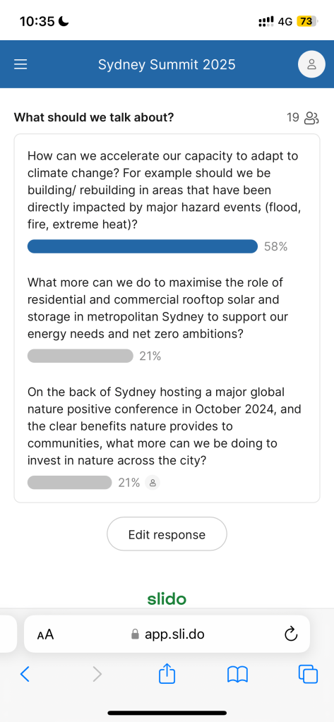 The agenda included hearing from various analysts, economist, and policy-makers in Sydney about differing reports from the past year, such as the ‘Life in Sydney’ report and the ‘State of the City’ report; panel discussions exploring productivity and prosperity in an era of uncertainty; ‘Big Idea’ pecha kucha presentations to envision new visions of Sydney by 2027; political conversations and federal election analysis in anticipation of this years federal election; considerations around climate change and how it will affect the city; and understanding how unpaid labour and the time-cost of caring responsibilities has an affect on the workforce in Sydney. Throughout the summit, audience members were invited to vote on what questions they would like discussed in panels.